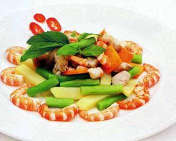 - Đun một thìa súp dầu ăn, cho lần lượt đu đủ, khoai tây, đậu que, tôm vào xào chín. Cuối cùng cho cá chẽm vào, nêm 2 thìa cà phê hạt nêm, 1 thìa cà phê đường.