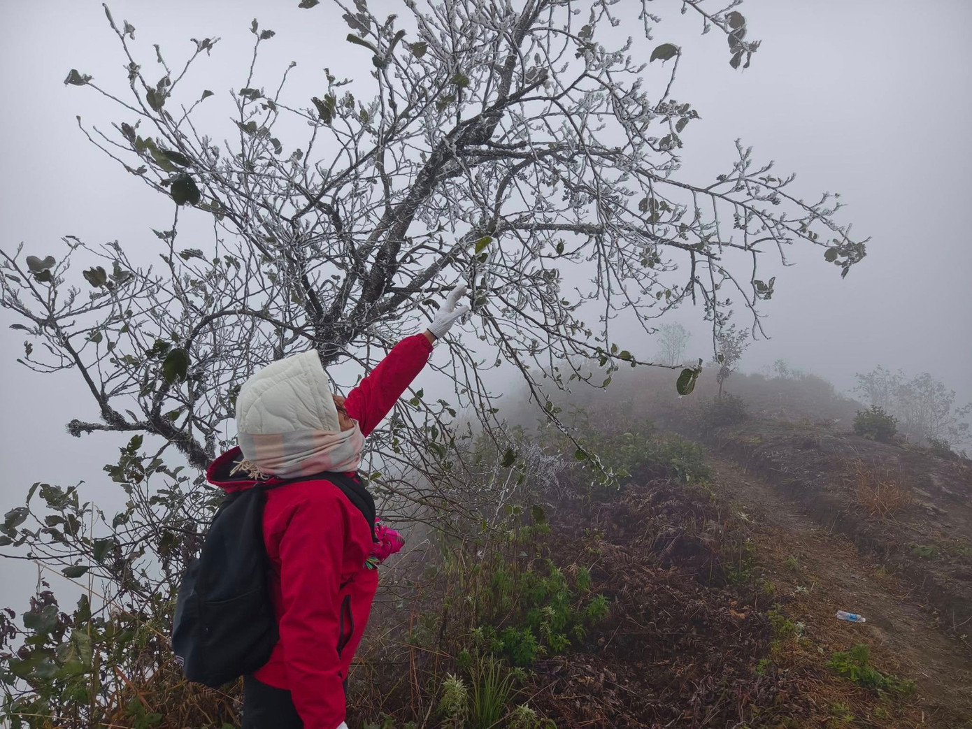 Tương tự anh Cung, Kiều Tùng Lâm (ở Hà Nội) cũng may mắn bắt gặp hiện tượng băng giá trong tour dẫn đoàn khách tới trải nghiệm đỉnh ở Kỳ Quan San (huyện Bát Xát, tỉnh Lào Cai).