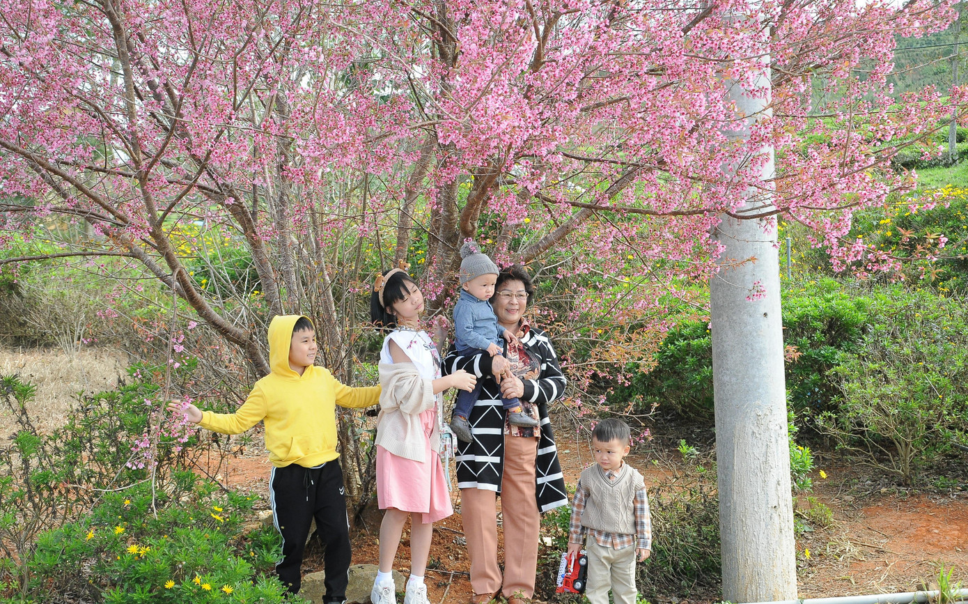 | Cả nhà cùng chụp ảnh dưới mai anh đào khoe sắc. |