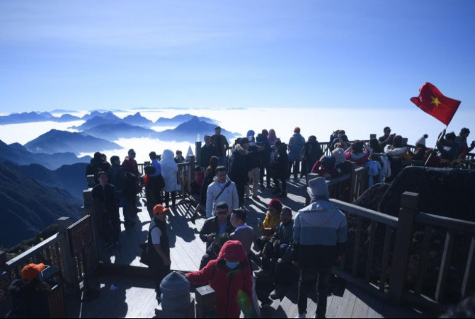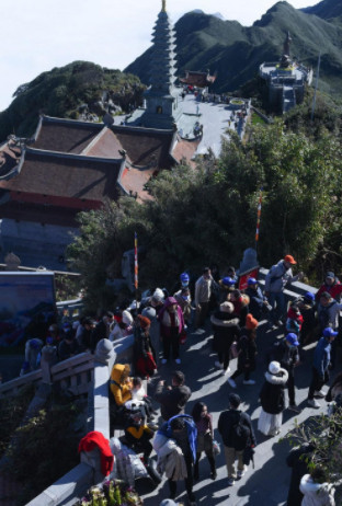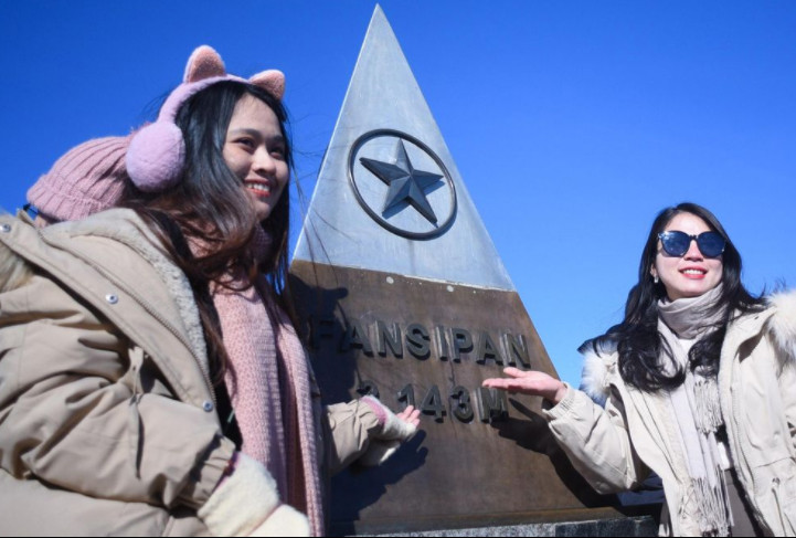 Du khách vui vẻ chụp ảnh với cột mốc của nóc nhà Đông Dương.