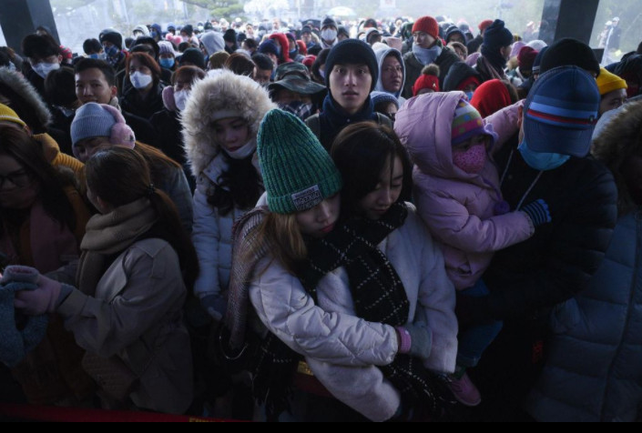 Trái với sự mù mịt giăng kín bên dưới thành phố Sa Pa, sáng nay, phía trên đỉnh Fansipan trời quang. Tuy nhiên nhiệt độ vẫn ở mức 6 độ C và kèm theo gió lạnh. 9h30, nơi này đã chật cứng người.