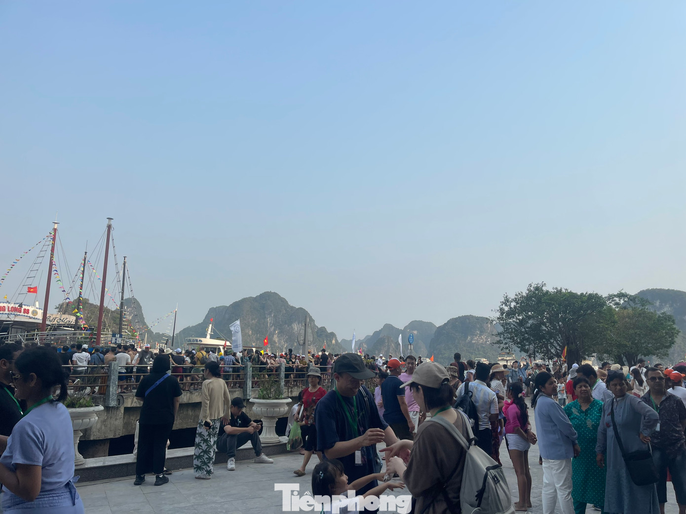 | Ghi nhận trong ngày 30/4 và sáng 1/5, lượng du khách mua vé đi tàu thăm quan Vịnh Hạ Long ở Cảng tàu quốc tế Hạ Long chật kín. Nhiều gia đình phải chờ đợi suốt 2 tiếng mới mua được vé. |