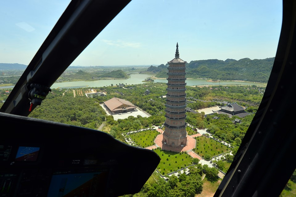 Cảnh chùa Bái Đính. Ảnh: M.Đ So với cách ngắm cảnh trước đây là đi thuyền thì bay trực thăng mang đến cảm giác mới mẻ hơn, không gian rộng mở choáng ngợp và đẹp hơn rất nhiều. Tuyệt vời hơn nữa là được bay trên Quần thể danh thắng Tràng An - Di sản Văn hoá và Thiên nhiên thế giới, di sản hỗn hợp đầu tiên ở Đông Nam Á đã được UNESCO công nhận. Đây chắc chắn sẽ là một trải nghiệm không thể bỏ lỡ trong đời của du khách.