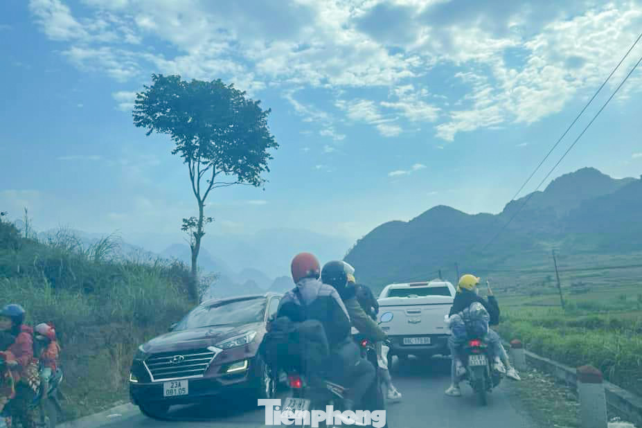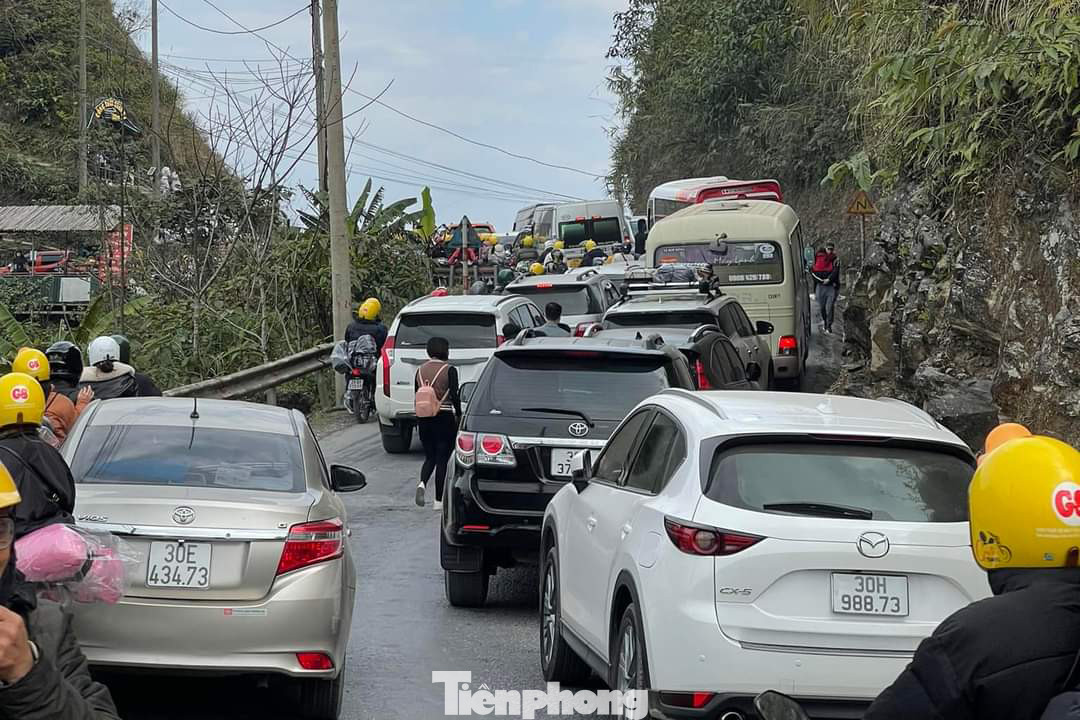 | Nhiều phương tiện dừng đỗ ở khu vực phía trước cổng trời Quản Bạ, khiến dòng xe bị ùn tắc kéo dài dọc tuyến đường quốc lộ 4C. |