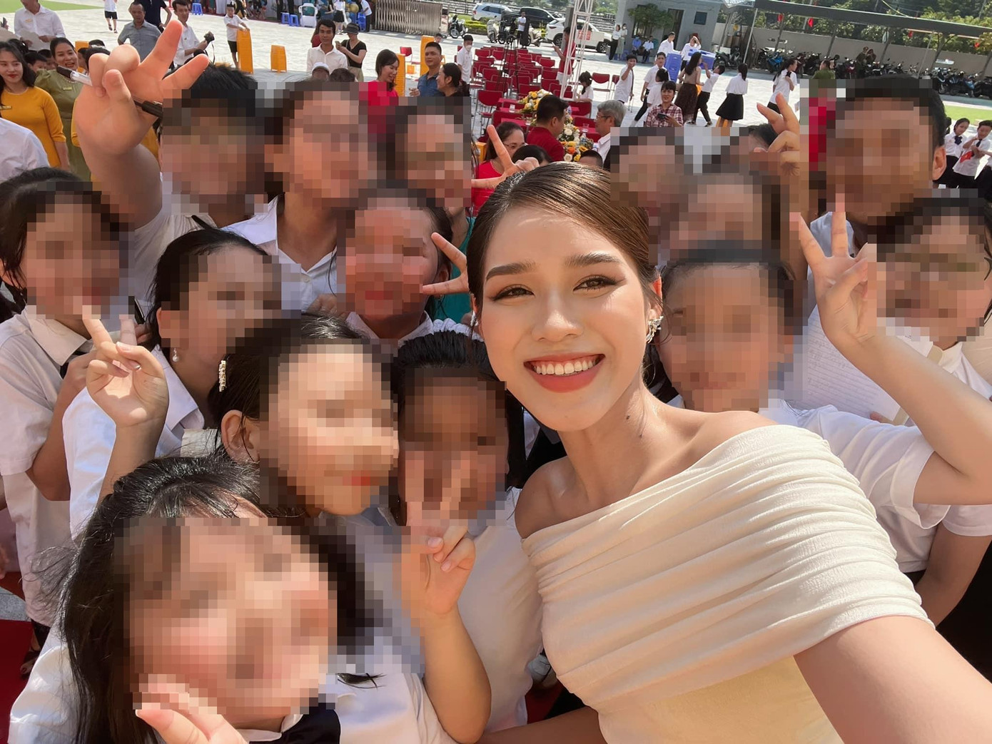 Hoa hậu Đỗ Thị Hà thì ghé thăm một trường học khác của Thanh Hóa. Tuy không mặc áo dài nhưng Đỗ Thị Hà vẫn rất khéo léo lựa chọn bộ váy trắng trễ vai kín đáo, hợp với không khí của ngày khai giảng.