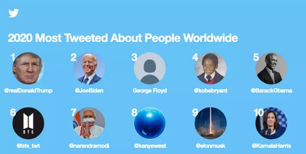 Trong Top 10 các nhân vật được nhắc đến nhiều nhất trên Twitter, tính trên phạm vi thế giới, thì có nhiều nhân vật liên quan đến chính trị: Tổng thống Donald Trump, ông Joe Biden, Tổng thống Barack Obama, bà Kamala Harris…, cho thấy sự quan tâm của tất cả mọi người đến lĩnh vực chính trị bỗng tăng vọt trong năm nay.