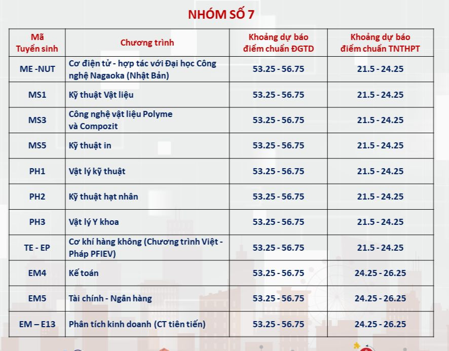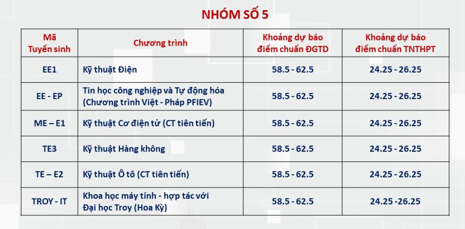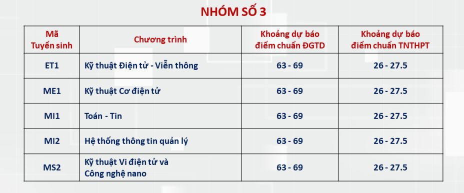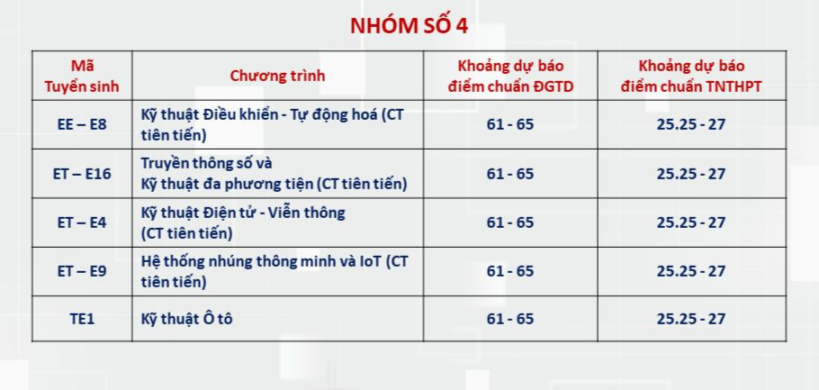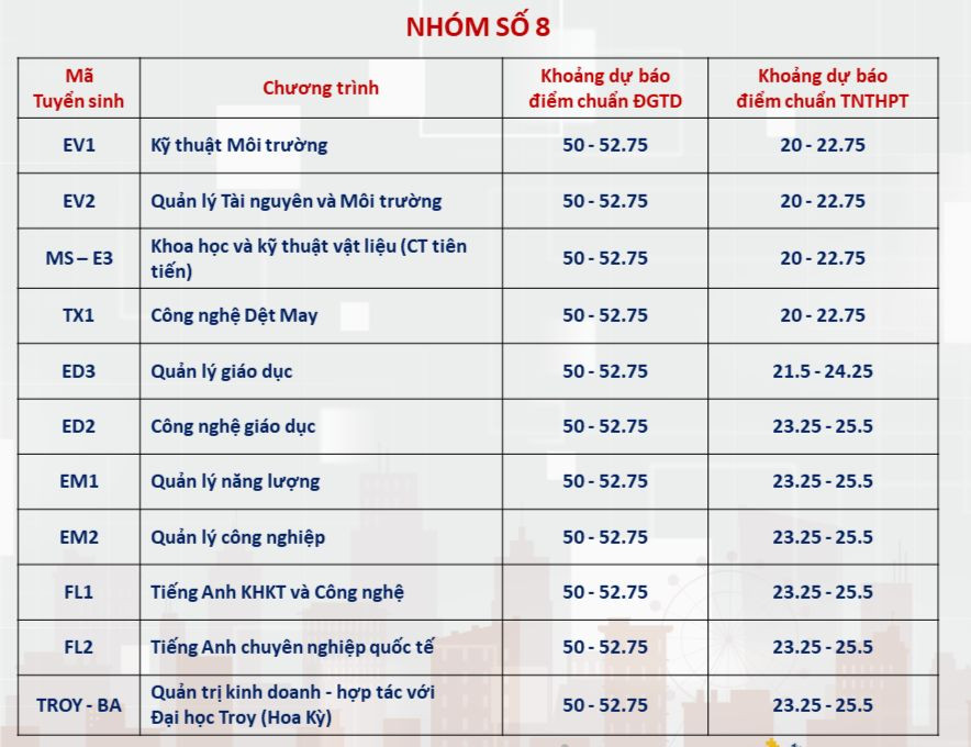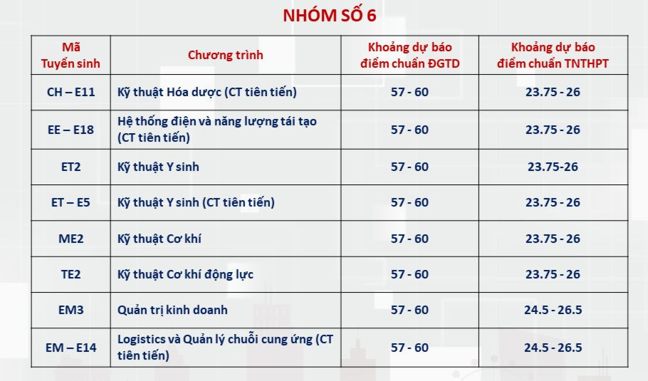 Cũng theo bảng dự báo, điểm chuẩn thấp nhất dựa vào kết quả thi tốt nghiệp THPT trong khoảng 20 - 22,75 điểm. Các ngành trong nhóm này là Kỹ thuật Môi trường (EV1), Quản lý Tài nguyên và Môi trường (EV2), CTTT Khoa học và kỹ thuật vật liệu (MS-E3), Công nghệ Dệt May (TX1). Mức dự báo năm 2024 của các ngành này có sự tăng nhẹ so với mức dự báo năm 2023 là 0,75 điểm.