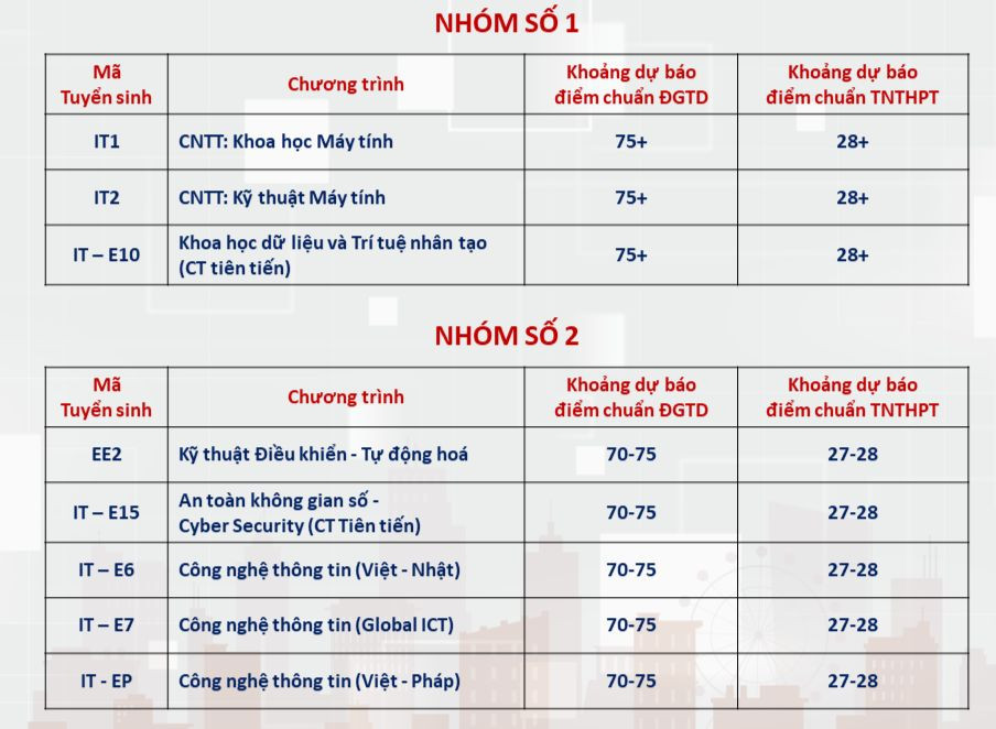 Theo đó, năm 2024, chương trình đào tạo của Đại học Bách khoa Hà Nội có điểm chuẩn dự báo cao nhất thuộc về lĩnh vực Công nghệ thông tin với ngành: Khoa học máy tính (IT1), Kỹ thuật máy tính (IT2) và Khoa học Dữ liệu và Trí tuệ Nhân tạo (IT-E10). Điểm chuẩn dự báo của nhóm ngành này luôn nằm trong top cao nhất của Đại học Bách khoa Hà Nội trong những năm gần đây.