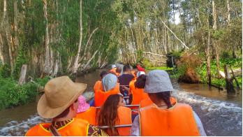 Cung bậc cảm xúc khác lạ khi được bổng bềnh trải nghiệm bằng phương tiện xuồng len lỏi qua các dòng kênh nhỏ dưới tán rừng tràm. Từng chiếc “Du thuyền hạng nhẹ” rẽ bèo lướt sóng đưa mọi người chạm khẽ vào hệ sinh thái đa dạng và đặc trưng của rừng ngập nước.