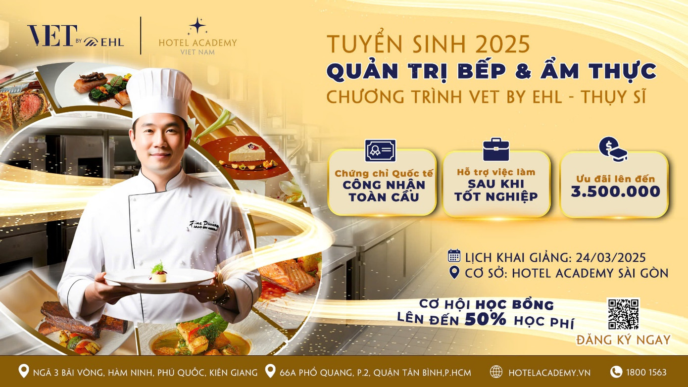 Đặc biệt, vào ngày 24/03/2025 tới đây tại Hotel Academy Sài Gòn (66A Phổ Quang, P.2, Q. Tân Bình, TP. HCM), học viện sẽ khai giảng chương trình Quản trị Bếp & Ẩm thực. Đây là khóa học được thiết kế dành riêng cho những ai đam mê ẩm thực và muốn xây dựng sự nghiệp chuyên nghiệp trong ngành bếp, với tiêu chuẩn đào tạo từ Thụy Sĩ, quốc gia có nền ẩm thực nổi tiếng thế giới cùng những ưu đãi đặc biệt: Học bổng lên đến 50% học phí dành cho học viên xuất sắc; Ưu đãi học phí lên đến 3.500.000 đồng; Hỗ trợ việc làm ngay sau khi tốt nghiệp tại các nhà hàng, khách sạn 5 sao.