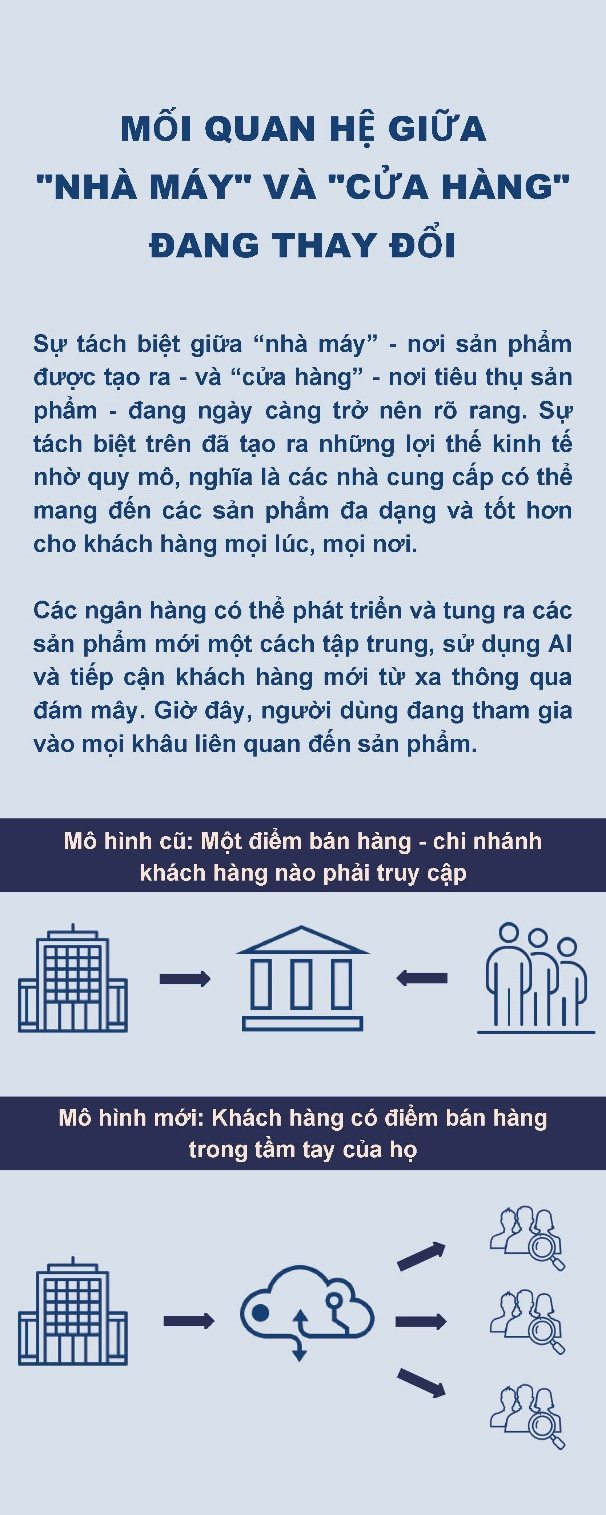 Trong một số ngành, ví dụ như ngành bán lẻ, sự tách biệt giữa “nhà máy” - nơi sản phẩm được tạo ra - và “cửa hàng” - nơi tiêu thụ sản phẩm - đang ngày càng trở nên rõ ràng do chuỗi cung ứng, phương thức phân phối và phạm vi tiếp thị đều đã phát triển mạnh mẽ. Từ đó tạo ra những lợi thế kinh tế nhờ quy mô, nghĩa là các nhà cung cấp có thể mang đến các sản phẩm đa dạng và tốt hơn cho khách hàng mọi lúc, mọi nơi. Tương tự như vậy, những tiến bộ mới nhất về năng lực tính toán đã tạo ra khả năng bổ sung mạng lưới phân phối và tiếp cận khách hàng mới từ xa, từ đó, chuyển đổi ngành ngân hàng.