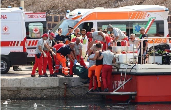 Lực lượng cứu hộ chuyển thi thể nạn nhân vụ lật du thuyền ngoài khơi cảng Porticello, Italy ngày 19/8/2024. Ảnh: Reuters/TTXVN
