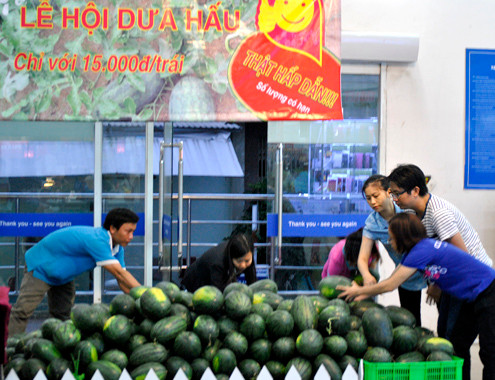 Để giải quyết trước mắt đầu ra cho bà con hiện nay, một số đơn vị bán lẻ, siêu thị trong nước đã đứng ra thu mua dưa hấu cho bà con tại ruộng. Trao đổi với VnExpress.net, Phó tổng giám đốc Saigon Co.op Nguyễn Thành Nhân cho biết đã trực tiếp liên lạc với các phòng nông nghiệp các tỉnh miền Trung và miền Tây Nam Bộ để tiêu thụ dưa.