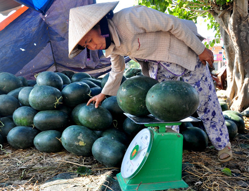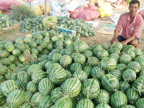 "Trước Tết vựa mua 4.300 đồng một kg, bán lẻ được 8.000 đồng. Vụ này dưa hấu dội chợ vì quá nhiều người thu hoạch cùng lúc", ông Rết nhận định.