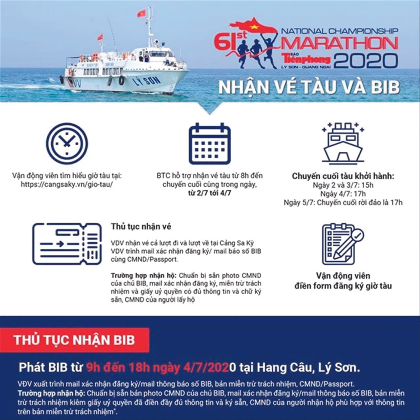 Một lưu ý quan trọng cho du khách đến đảo để tham dự giải chạy có một không hai ở đây là dù chọn phương án di chuyển nào, cũng cần có mặt tại cảng Sa Kỳ trước 16h30 chiều thứ Bảy, ngày 4/7/2020 để kịp làm thủ tục đón chuyến tàu cao tốc cuối cùng trong ngày ra đảo. Vì vậy, hãy tính toán thời gian di chuyển của bạn thật cẩn trọng. Tại cảng Sa Kỳ, đội ngũ tình nguyện viên của BTC sẽ đón tiếp và tặng vé đi tàu miễn phí, trị giá 340.000đ, cho các bạn đã đăng ký dự giải từ 8h đến 15h các ngày 2, 3/7. Ngày 4/7, chuyến tàu cuối cùng đi Lý Sơn sẽ khởi hành lúc 17h, trong khi chuyến tàu cuối rời Lý Sơn ngày 5/7 cũng xuất phát lúc 17h.
