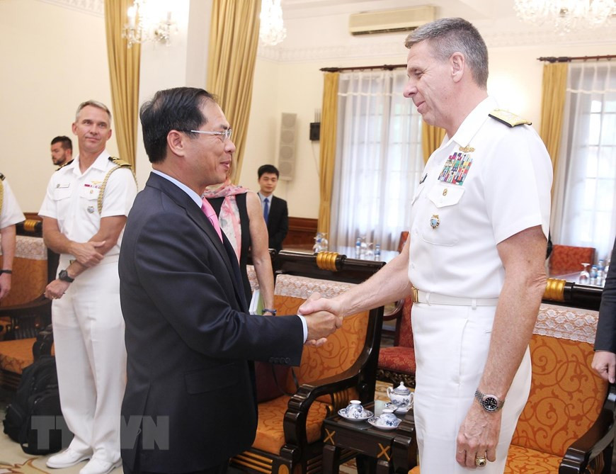 Chiều 16/4/2019, tại Hà Nội, Thứ trưởng Thường trực Bộ Ngoại giao Bùi Thanh Sơn tiếp Đô đốc Philip Davidson, Tư lệnh Bộ Tư lệnh Ấn Độ Dương-Thái Bình Dương của Hoa Kỳ, nhân dịp sang thăm và làm việc tại Việt Nam. (Ảnh: Lâm Khánh/TTXVN)