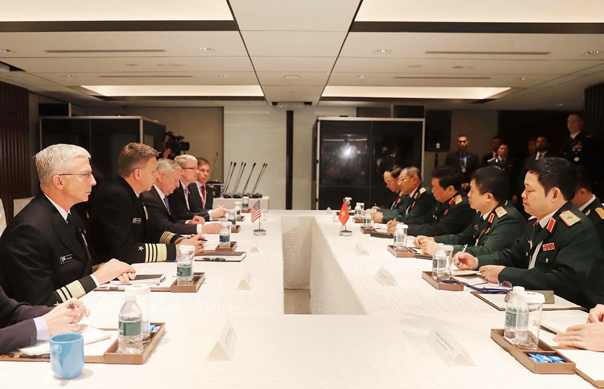 Sáng 1/6/2019, bên lề Hội nghị thượng đỉnh An ninh châu Á - Đối thoại Shangri-La lần thứ 18 tại Singapore, Đại tướng, Bộ trưởng Quốc phòng Ngô Xuân Lịch gặp song phương Bộ trưởng Quốc phòng Hoa Kỳ James Mattis. (Ảnh: Xuân Vịnh/TTXVN)