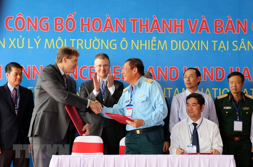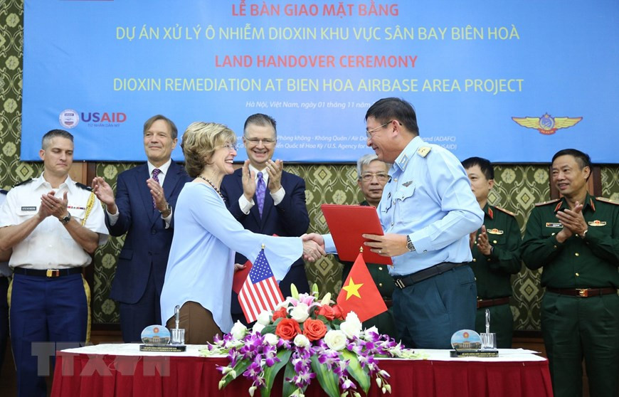 Ngày 7/11/2018, tại sân bay Đà Nẵng, Bộ Quốc phòng Việt Nam, Bộ Giao thông Vận tải phối hợp với Đại sứ quan Hoa Kỳ tại Việt Nam cùng các cơ quan liên quan tổ chức lễ ký thỏa thuận bàn giao 13,7ha đất sạch đã xử lý tại Sân bay Quốc tế Đà Nẵng cho Bộ Giao thông Vận tải quản lý. Buổi lễ cũng đánh dấu việc hoàn thành Dự án Xử lý Môi trường Ô nhiễm Dioxin tại Sân bay Đà Nẵng kéo dài 6 năm với kinh phí 110 triệu đô la do Cơ quan Phát triển Quốc tế Hoa Kỳ (USAID) và Bộ Quốc phòng Việt Nam phối hợp thực hiện. (Ảnh: Nguyễn Sơn/TTXVN)