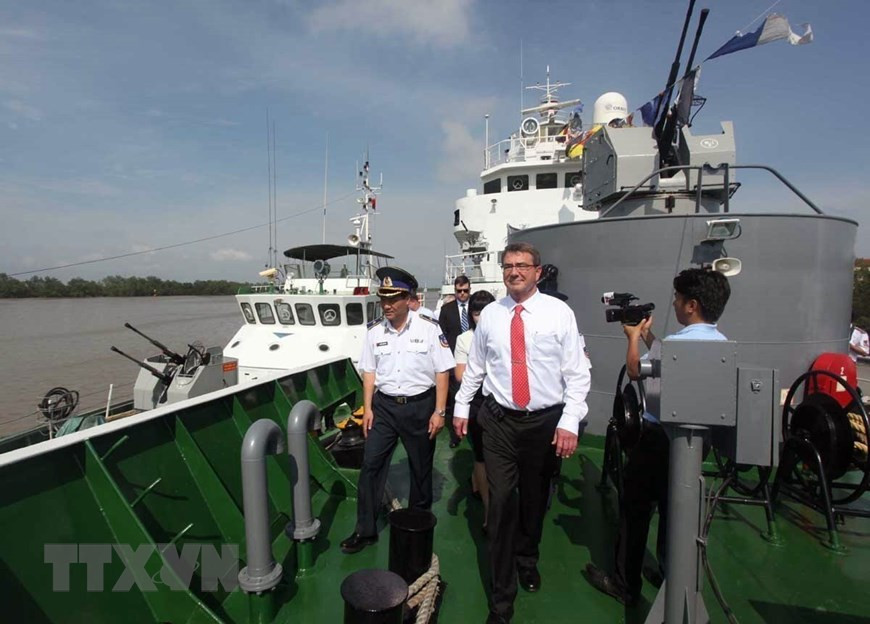 Bộ trưởng Quốc phòng Mỹ Ashton Carter thăm tàu Cảnh sát biển 8003, ngày 31/5/2015, trong chuyến thăm Bộ Tư lệnh Vùng Cảnh sát biển 1, tại thành phố Hải Phòng. (Ảnh: TTXVN phát)