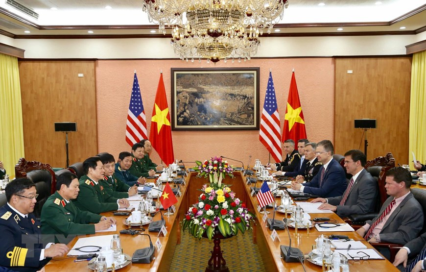 Sáng 20/11/2019, tại Hà Nội, Đại tướng Ngô Xuân Lịch, Uỷ viên Bộ Chính trị, Phó Bí thư Quân uỷ Trung ương, Bộ trưởng Bộ Quốc phòng đón và hội đàm với Bộ trưởng Bộ Quốc phòng Hoa Kỳ Mark Esper thăm chính thức Việt Nam. Chuyến thăm nhằm đưa quan hệ quốc phòng song phương hai nước tiếp tục đi vào chiều sâu, thực chất và hiệu quả, triển khai các nội dung hợp tác trong lĩnh vực quốc phòng đã ký giữa hai bộ quốc phòng. (Ảnh: Dương Giang/TTXVN