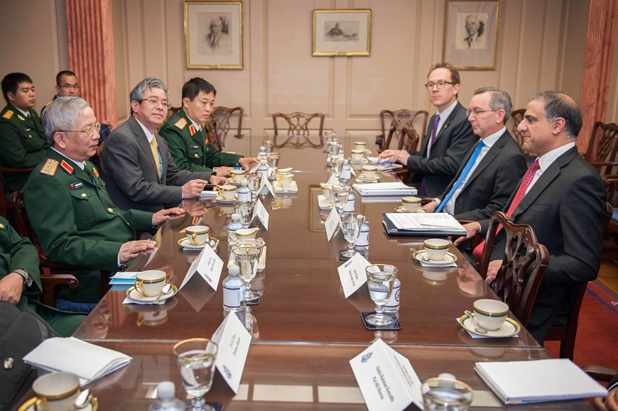 Thứ trưởng Bộ Quốc phòng Nguyễn Chí Vịnh làm việc với Trợ lý Bộ trưởng Quốc phòng Hoa Kỳ Puneet Talwar, trong chuyến thăm và làm việc tại Hoa Kỳ từ ngày 23-24/3/2015. (Ảnh: Thanh Tuấn/TTXVN)