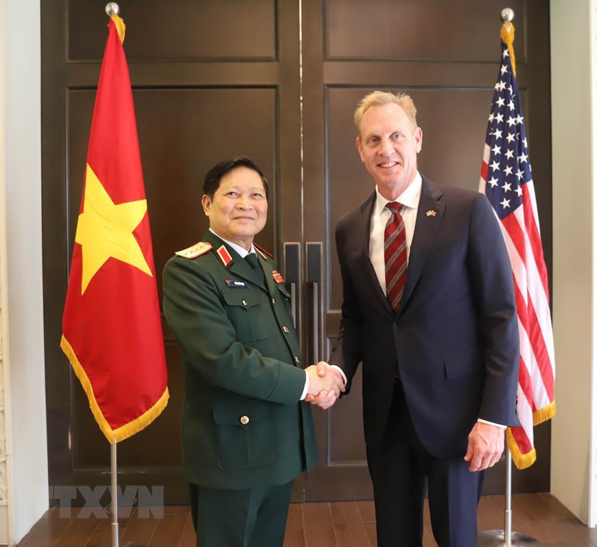 Chiều 1/6/2019, tại cuộc gặp song phương Bộ trưởng Quốc phòng Ngô Xuân Lịch bên lề Hội nghị thượng đỉnh An ninh châu Á - Đối thoại Shangri-La lần thứ 18 diễn ra ở Singapore, Quyền Bộ trưởng Quốc phòng Hoa Kỳ Patrick Shanahan nhấn mạnh, Hoa Kỳ hoan nghênh tiếng nói của Việt Nam trong khu vực và trên thế giới, đồng thời ủng hộ Việt Nam đảm nhiệm thành công vai trò Chủ tịch Hiệp hội các quốc gia Đông Nam Á (ASEAN) vào năm 2020. Ông Patrick Shanahan đánh giá cao việc Việt Nam tham gia hoạt động gìn giữ hòa bình của Liên hợp quốc. (Ảnh: Xuân Vịnh/TTXVN)