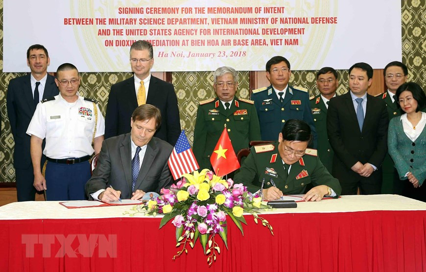 Lễ ký bản ghi nhận ý định giữa Cục khoa học quân sự, Bộ Quốc phòng Việt Nam với Cơ quan Phát triển Quốc tế Hoa Kỳ (USAID) về xử lý ô nhiễm dioxin ở khu vực sân bay Biên Hòa, Việt Nam (23/1/2018). (Ảnh: An Đăng/TTXVN)