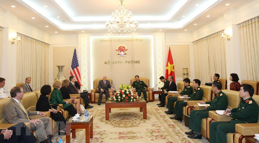 Sáng 18/4/2019, tại Hà Nội, Đại tướng Ngô Xuân Lịch, Ủy viên Bộ Chính trị, Phó Bí thư Quân ủy Trung ương, Bộ trưởng Bộ Quốc phòng tiếp đoàn Thượng nghị siỹ Hoa Kỳ, do Thượng nghị sĩ Patrick Leahy, Phó Chủ tịch Ủy ban Chuẩn chi Thượng viện Hoa Kỳ dẫn đầu, nhân dịp sang thăm và làm việc tại Việt Nam. (Ảnh: TTXVN phát)