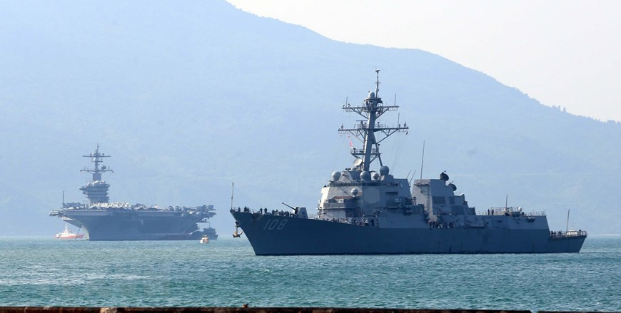 Ngày 5/3/2018, Việt Nam đón nhóm tàu Hải quân Mỹ gồm tàu sân bay USS Carl Vinson (CVN 70); tuần dương hạm USS Lake Champlain (CG-57) và tàu khu trục USS Wayne E. Meyer (DDG-108) đến thăm, giao lưu với Hải quân Việt Nam tại thành phố Đà Nẵng trong 5 ngày. (Ảnh: Trần Lê Lâm/TTXVN)