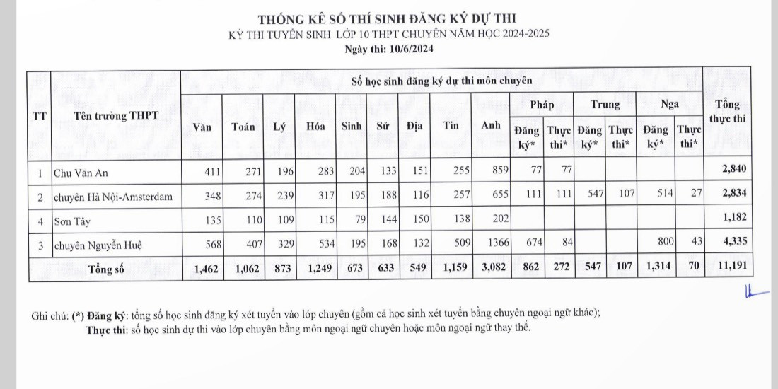 Toàn thành phố có 11,191 học sinh đăng ký dự tuyển vào 4 trường THPT chuyên và trường có lớp chuyên gồm: THPT Chu Văn An, THPT chuyên Hà Nội Amsterdam, THPT Sơn Tây, THPT chuyên Nguyễn Huệ.