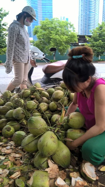 Chị Phạm Thị Dung, chủ của sạp dừa Xiêm tại phố mới Nguyễn Chanh (Cầu Giấy) cho biết, các sạp dừa Xiêm vỉa hè mới hình thành từ khoảng 2 tuần nay. Dừa đều có xuất xứ từ các tỉnh Đồng bằng Sông Cửu Long, nhiều nhất là Bến Tre.