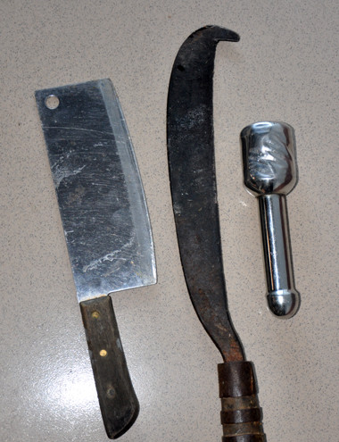 Một số vật dụng gia đình như rựa, búa, dao và chày giã bị móp méo... cùng chiếc gối lấm đầy bụi nằm ngổn ngang dưới sàn nhà, cạnh két sắt bị đục thủng lỗ lớn. Ổ khóa cửa sau và cửa gian buồng bị cạy phá mở toang.