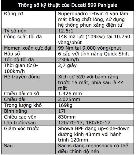 Và kết quả là chiếc 899 Panigale đạt được những con số thể hiện sức mạnh vượt trội của mình mà không phải tay đua kinh nghiệm nào cũng dễ dàng chế ngự; tốc độ tối đa 230km/h, khả năng tăng tốc từ 0-100km/h hết 2,7 giây.