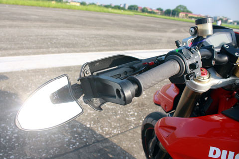 Lắp bộ gương tay lái đua ra hai bên, trọng tâm chiếc xe trở nên hạ xuống dũng mãnh như một chú đại bàng núi. Tất nhiên ở Việt Nam, sử dụng chiếc gương này là điều khá bất tiện bởi nó chiếm diện tích không gian ngang khá lớn.