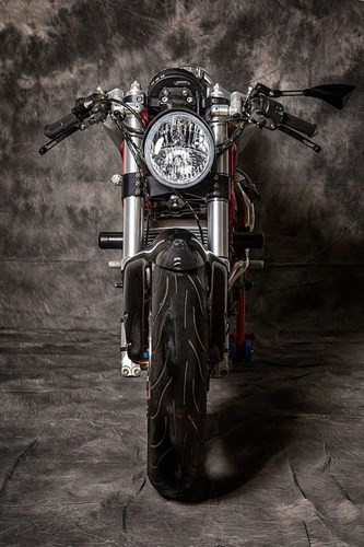 Dàn đầu gồm phuộc Ducati S2R, đèn pha Harley V-Rod, dè carbon dành cho Ducati 1098, chảng 3 XTR Ergal và tay láy clip-on Tomaselli.