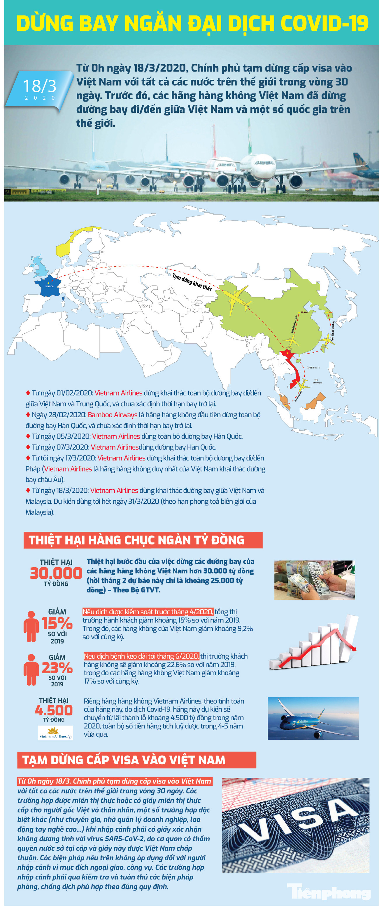 TPO - Từ 0h ngày 18/3/2020, Chính phủ tạm dừng cấp visa vào Việt Nam với tất cả các nước trên thế giới trong vòng 30 ngày. Trước đó, các hãng hàng không Việt Nam đã tạm dừng đường bay đi/đến giữa Việt Nam và một số quốc gia trên thế giới.