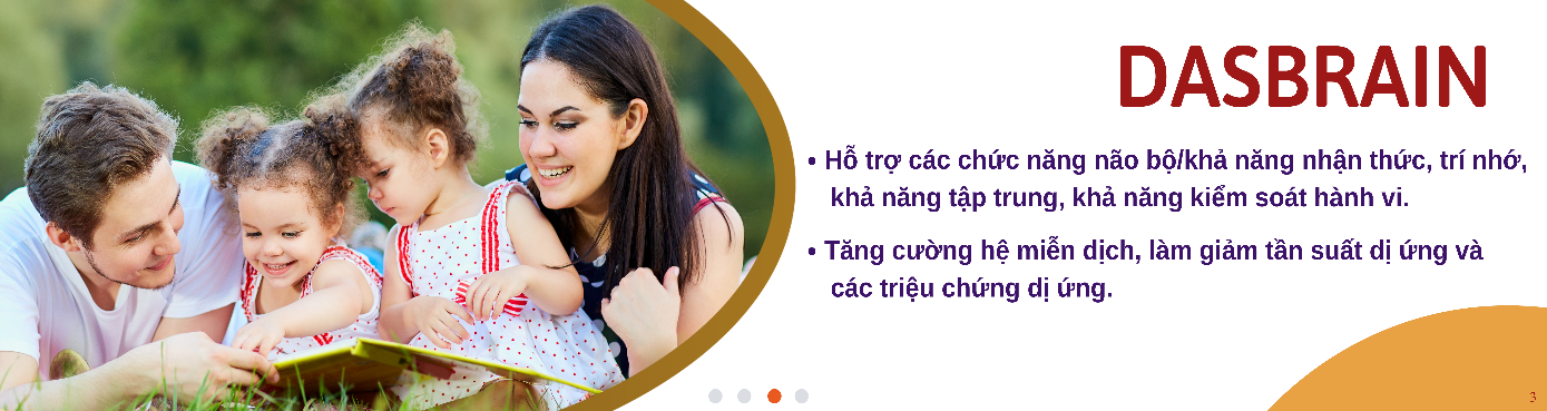 Dasbrain giúp Hỗ trợ các chức năng não bộ/ khả năng nhận thức, trí nhớ, khả năng tập trung, khả năng kiểm soát hành vi; Hỗ trợ Tăng cường hệ miễn dịch, làm giảm tần suất dị ứng và các triệu chứng dị ứng.