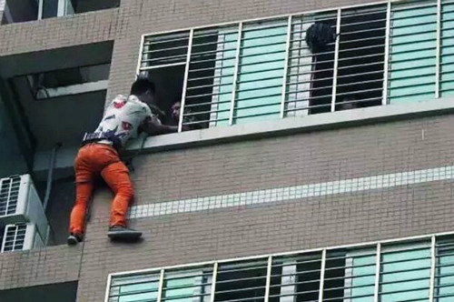 Do vị trí đó quá cao khiến thang không tới được nên lính cứu hỏa đã thả một sợi dây cho anh này buộc vào người rồi kéo vào căn hộ qua cửa sổ.