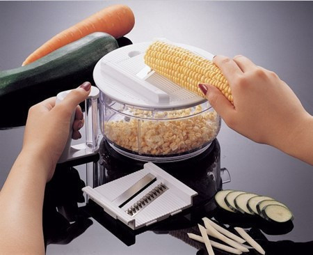 Dụng cụ đa năng với nhiều thiết bị nhỏ giúp bạn tạo hình rau quả theo các chiều khác nhau, thậm chí còn có thể giúp bà nội trợ gỡ hạt ngô một cách dễ dàng.