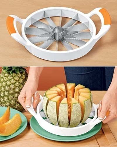 Chỉ với 1 thao tác đơn giả, dụng cụ cắt hoa quả này giúp bạn cắt đều các loại hoa quả phức tạp như dưa lưới hay quả dứa trông thật đẹp mắt.