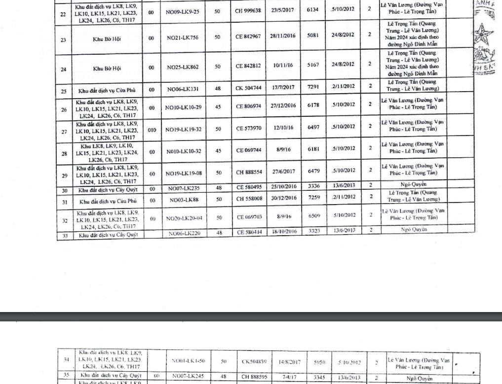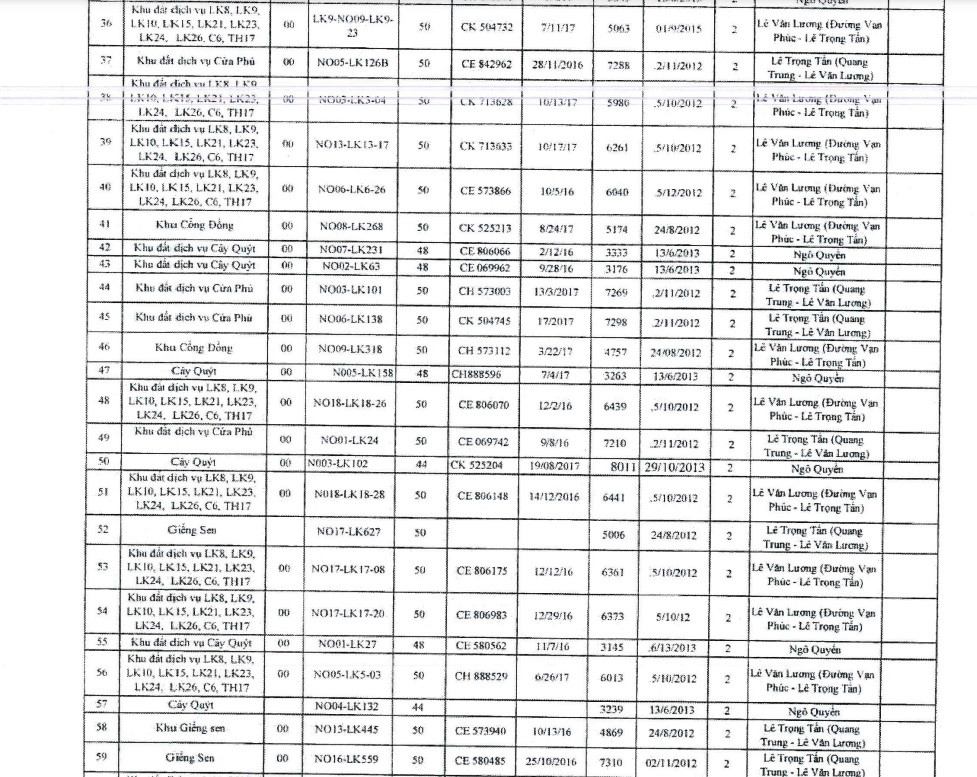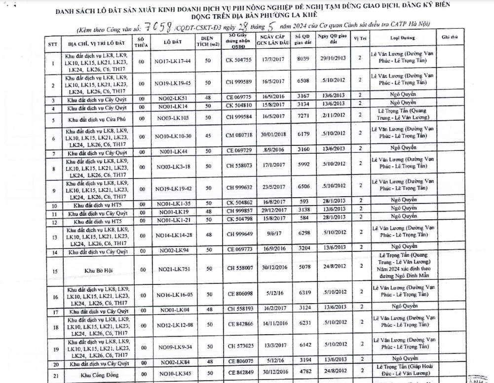 | Chi tiết danh sách 77 lô đất tại phường La Khê, quận Hà Đông (Hà Nội) bị dừng giao dịch. |