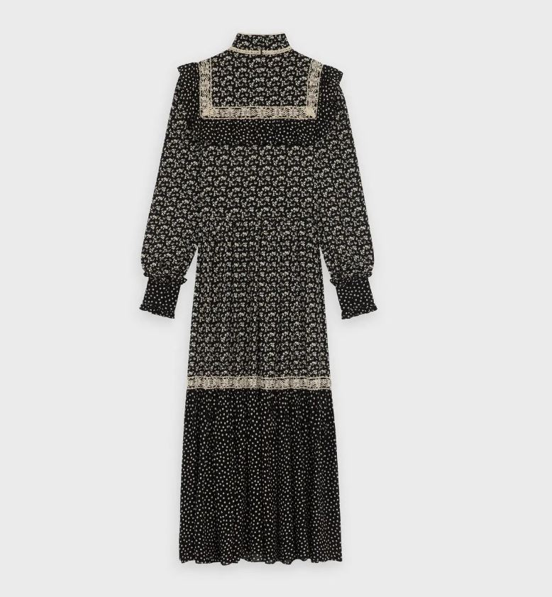 Bộ váy màu đen với họa tiết trắng kèm thắt lưng của thương hiệu xa xỉ CELINE có tổng giá trị lên tới 100 triệu đồng, với váy có giá khoảng 81 triệu đồng và thắt lưng có giá khoảng 19 triệu đồng. Chiếc váy có thiết kế cổ cao, dáng maxi rất dài, nếu không có chiều cao vượt trội thì thật sự không thể mặc được mẫu váy này.