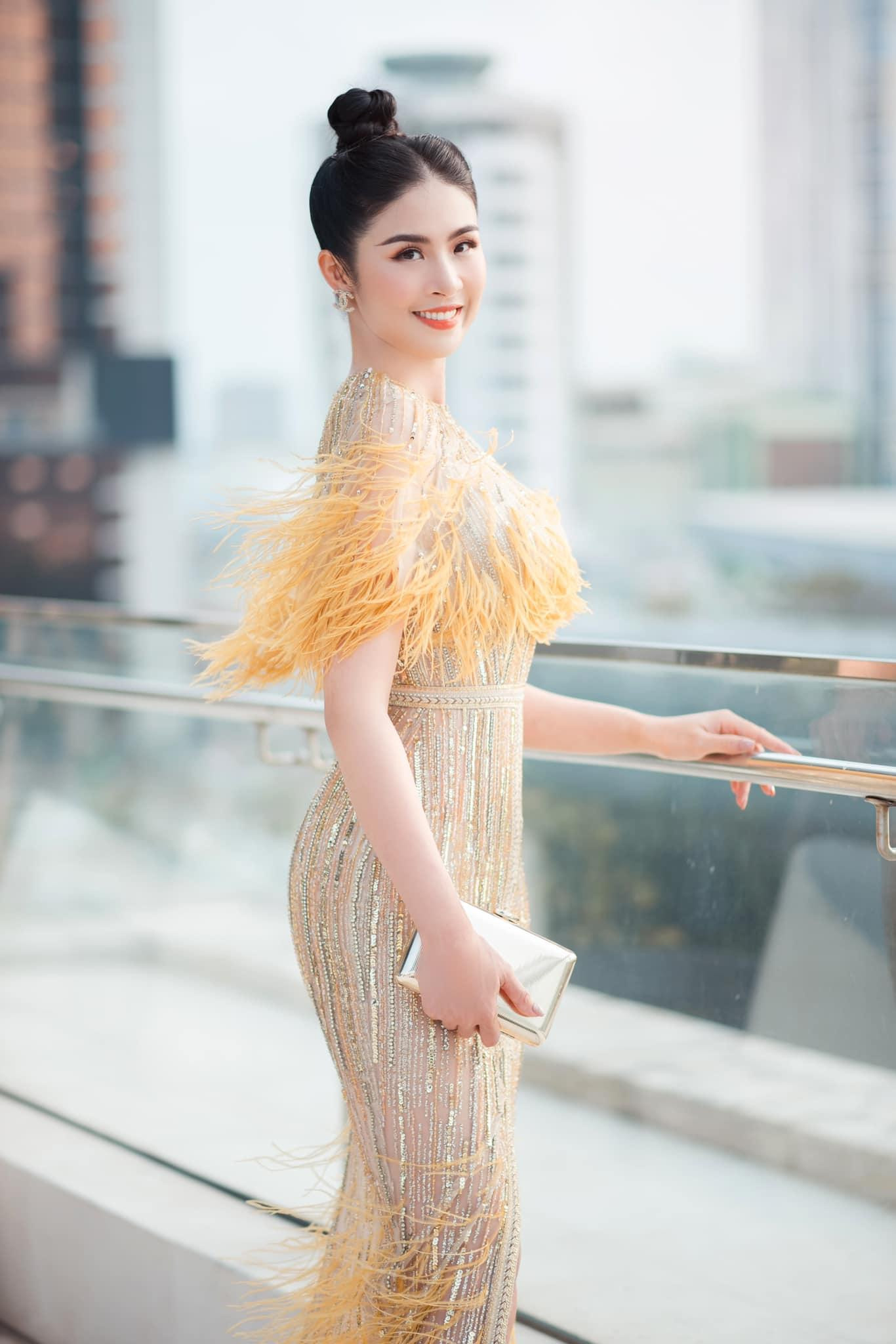 | Ngọc Thảo nổi bật với váy dạ hội màu nude được đính kết lông vũ vàng rực. |