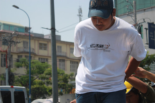 Nam thanh niên cao to trong chiếc áo thun trắng, đội nón Jeans được cho là kẻ gây án được đưa đến hiện trường.