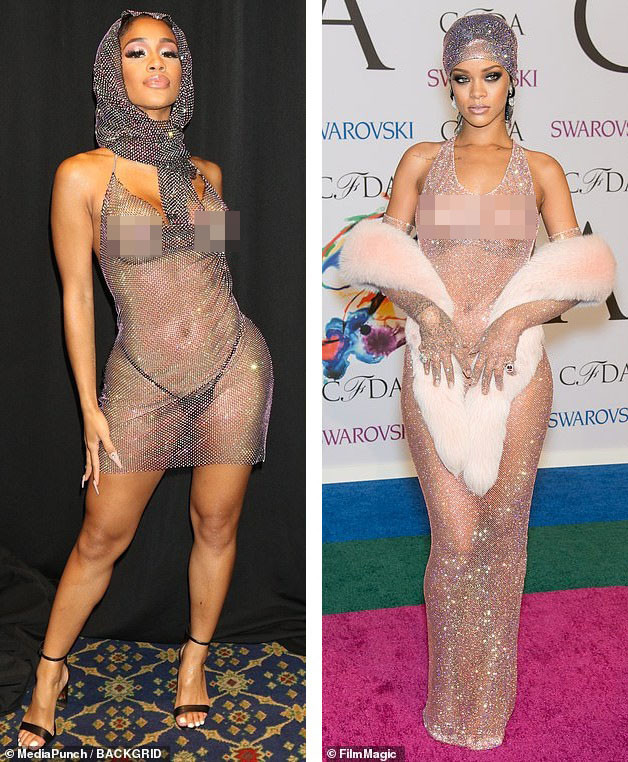 Chiếc váy "mặc như không" kết hợp với khăn trùm đầu khiến người ta nhớ về bộ cánh “khét tiếng” mà Rihanna mặc khi đến Lễ trao giải Biểu tượng Thời trang CFDA 2014.