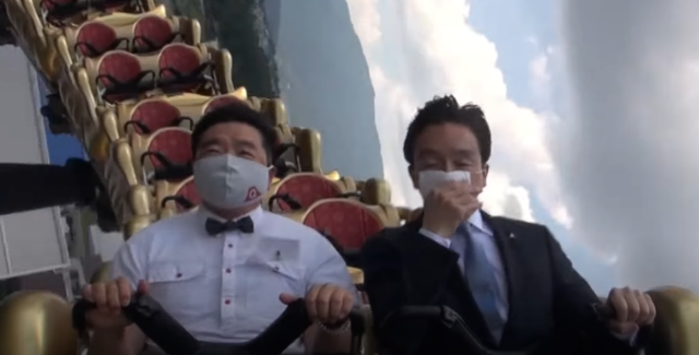 Tàu lượn siêu tốc vừa cao, vừa phức tạp ở công viên giải trí nổi tiếng Fuji-Q Highland. Ảnh: Klook. Nhưng các vị sếp Nhật là kiểu "nói được làm được" nhé! Để chứng minh rằng đi tàu lượn mà không la hét cũng... không sao, hai sếp lớn của công viên Fuji-Q Highland đã lập tức thực hành cho mọi người đều thấy. Bởi thế mà trên kênh YouTube của công viên giải trí này có đăng video hai người ăn mặc chỉnh tề, đeo khẩu trang chơi tàu lượn siêu tốc. Tàu có phi lên lao xuống, rung lắc thế nào thì hai người đó vẫn ngồi im thin thít và mặt thì siêu tỉnh.