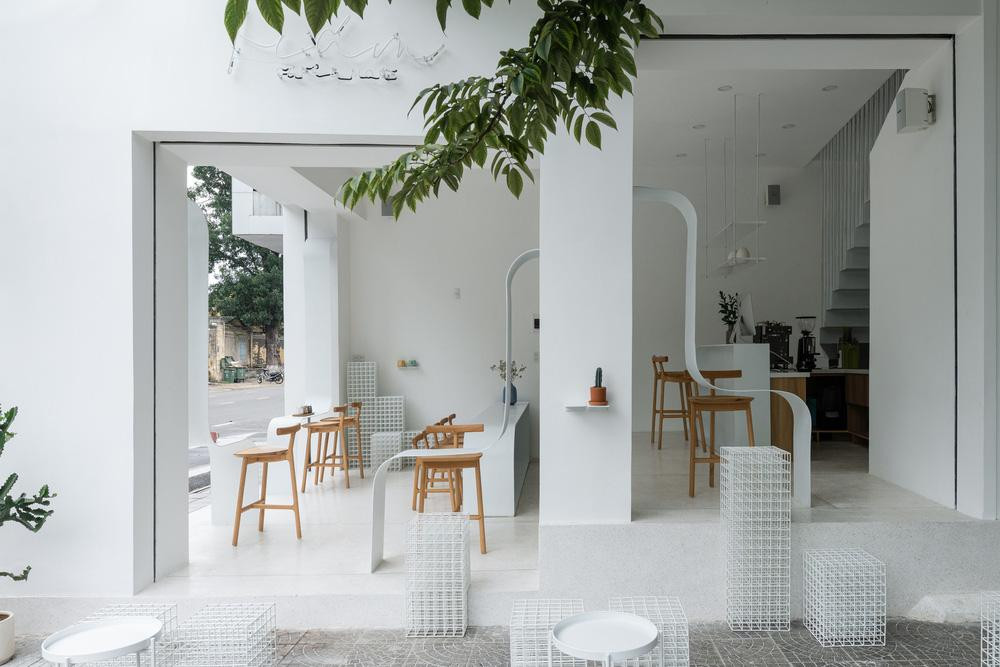 | Quán cà phê ở tầng một được thiết kế đồng bộ với tổng thể căn nhà. Những chiếc bàn cong uốn lượn, những chiếc ghế thanh mảnh và xuyên suốt đặt trong một không gian đơn sắc, khiến những món đồ và vật dụng nhiều màu sắc trở nên nổi bật, hứa hẹn là một địa điểm “check-in” đáng giá. |