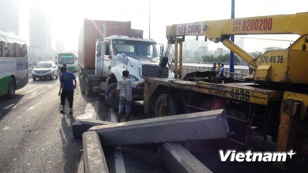 Hiện trường vụ tại nạn khiến giao thông trên cầu Sài Gòn bị kẹt. (Ảnh: Liếu Hà/Vietnam+)