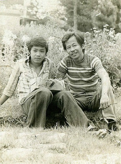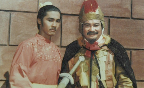 Lý Hùng (trái) năm 21 tuổi và cha - NSND Lý Huỳnh - trong phim "Thăng Long đệ nhất kiếm" (1990). Sau phim này, nghệ sĩ thay đổi hình ảnh bằng việc để râu quai nón và hàng ria con kiến.
