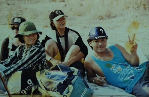 Lý Hùng (phải) năm 27 tuổi (1996) trên trường quay phim "Hồng hải tặc". Anh trông vạm vỡ hơn so với thời kỳ đóng phim "Nước mắt học trò".